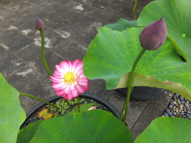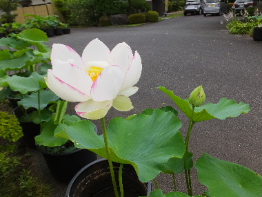 蕾が水面に上がってきてから開花まで2週間程かかります。開花1日目は完全には開かず(半開き)で